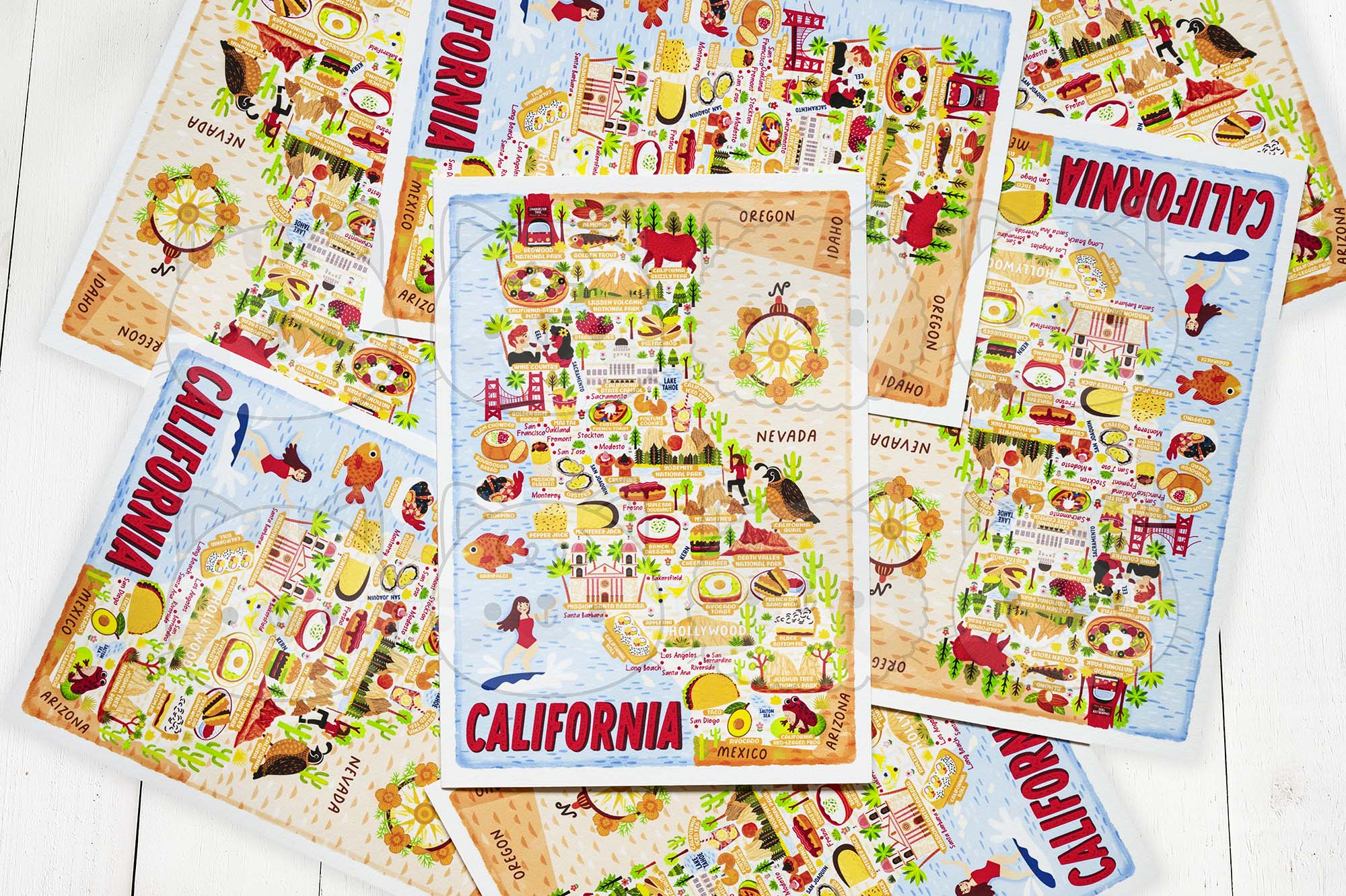 As with all of my maps, there are absolutely tonnes of detail in this California Map Postcard. There are people, buildings, cities, animals, food, and many other things.