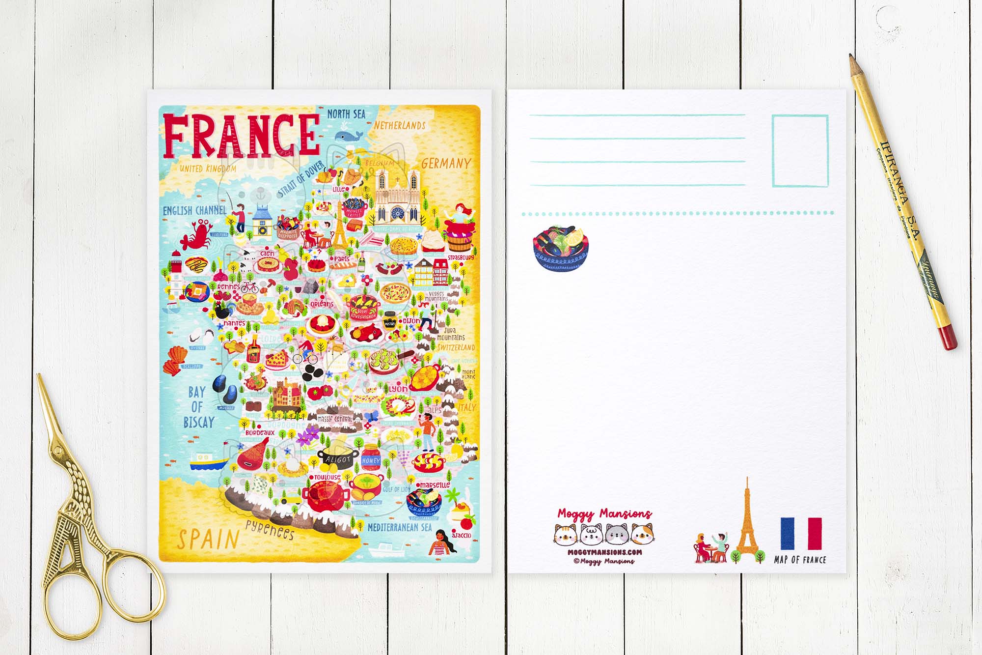 If you are collecting beautiful, unique, and special postcards, this France map postcard map illustration should definitely be added to your collection. I’m now doing a wholesale service, so if you are a retailer and you’re interested in my postcards, prints, or any of the other products I have listed on my website, please contact me anytime.