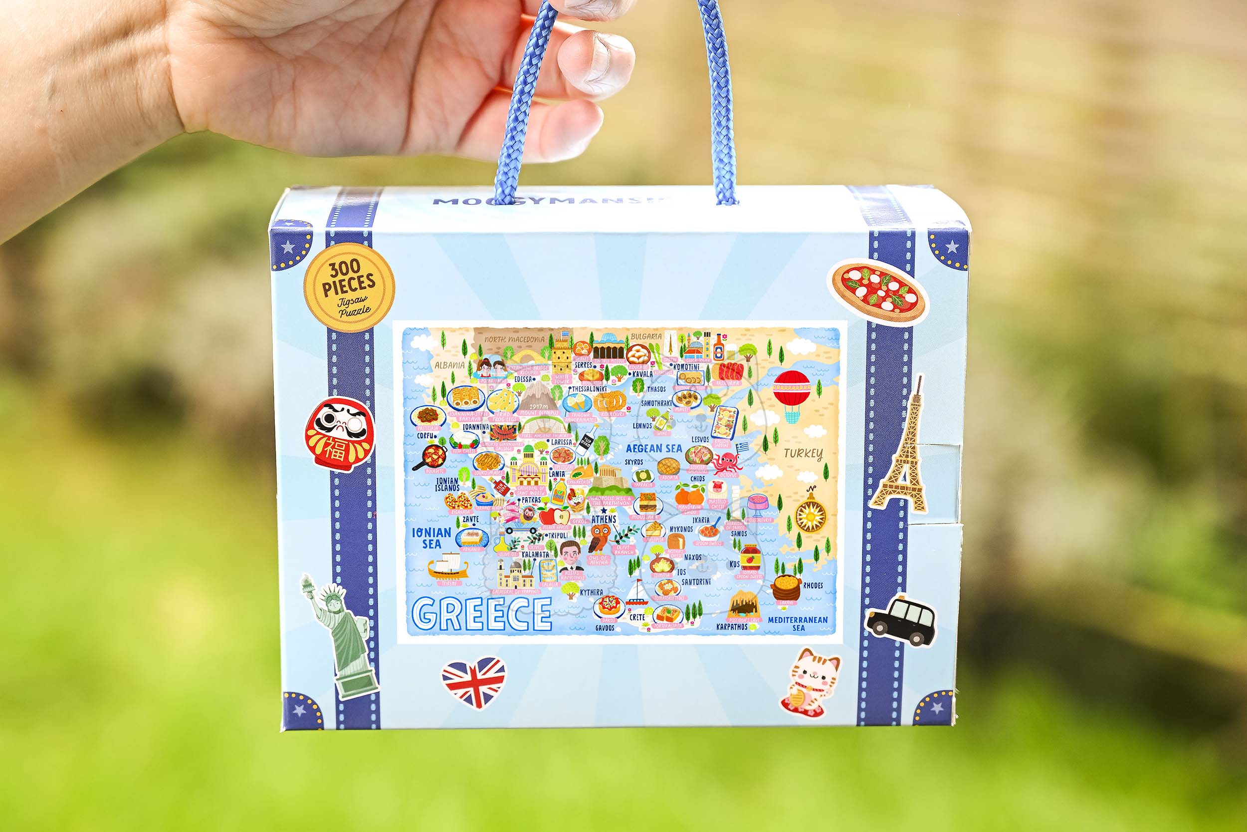 This Greece map puzzle comes supplied in a custom-made box that looks like a suitcase and shows our new branding. As of 2026 all of our products are moving over to our new website; https://moggymansions.com