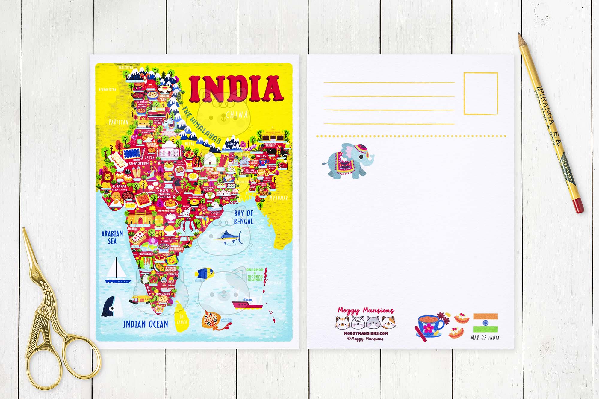 This India Food Map Postcard has been printed by myself on beautiful cotton rag paper. This is a fine-art paper that has a beautiful texture, great colour reproduction and perhaps most importantly is absolutely lovely to write on. This is a really premium postcard.