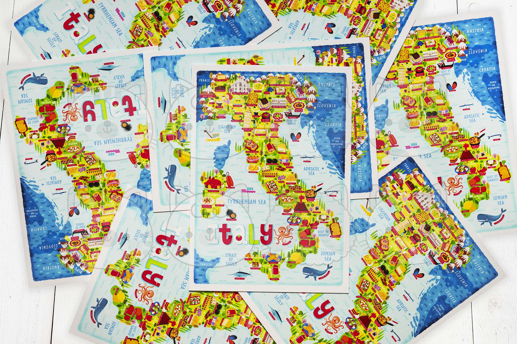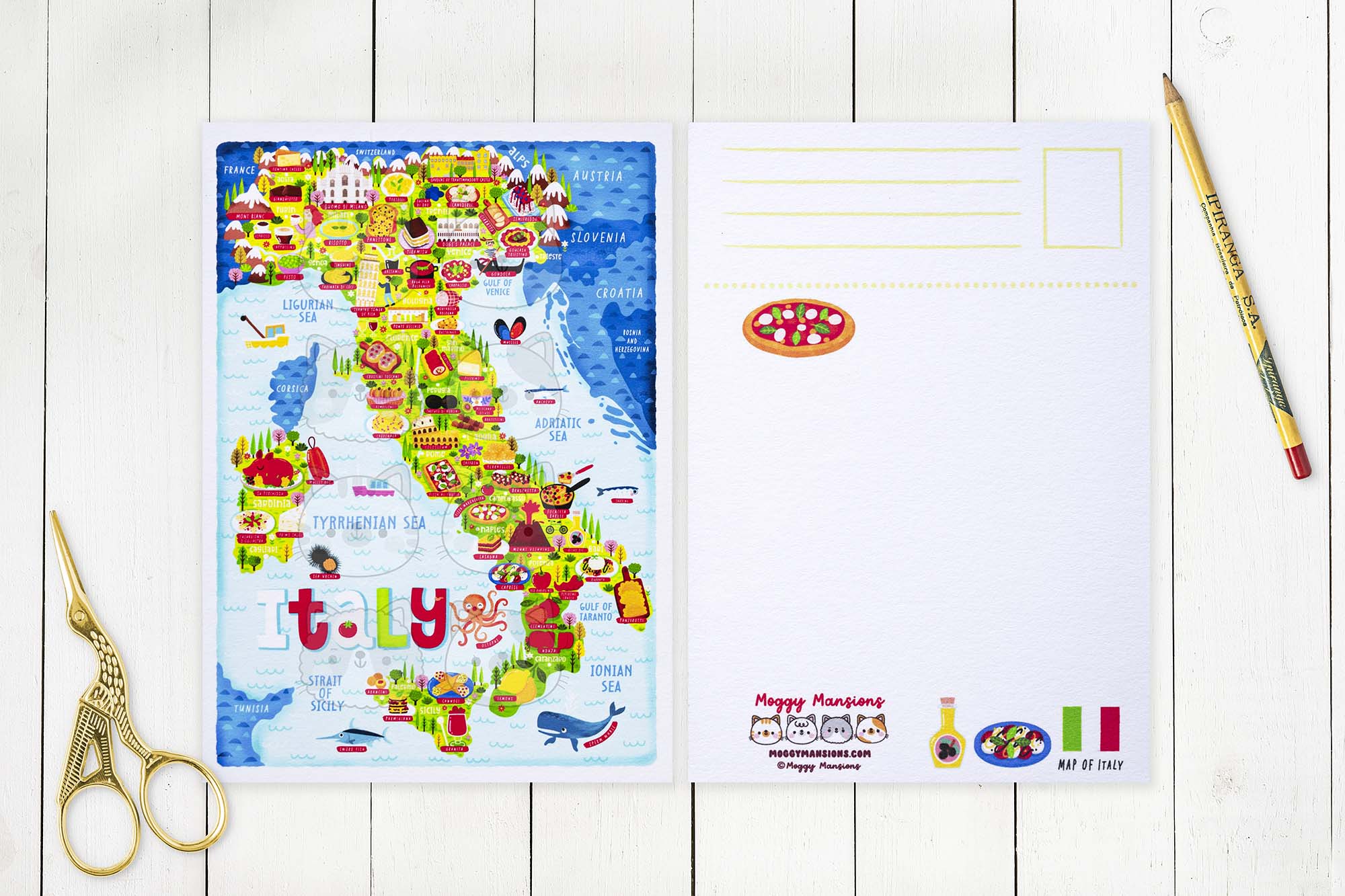 I visited Italy almost 20 years ago while I was studying to become a chef and I instantly loved it. Of course, you can buy Italian food all over the world, including in my home country Taiwan, but when you actually go to Italy, Mama Mia, the food is incredible. I loved the food, the sights, the sounds, the smells, and the culture, I absolutely loved it. This is my 21st map illustration and for this I made an Italy Map Postcard.