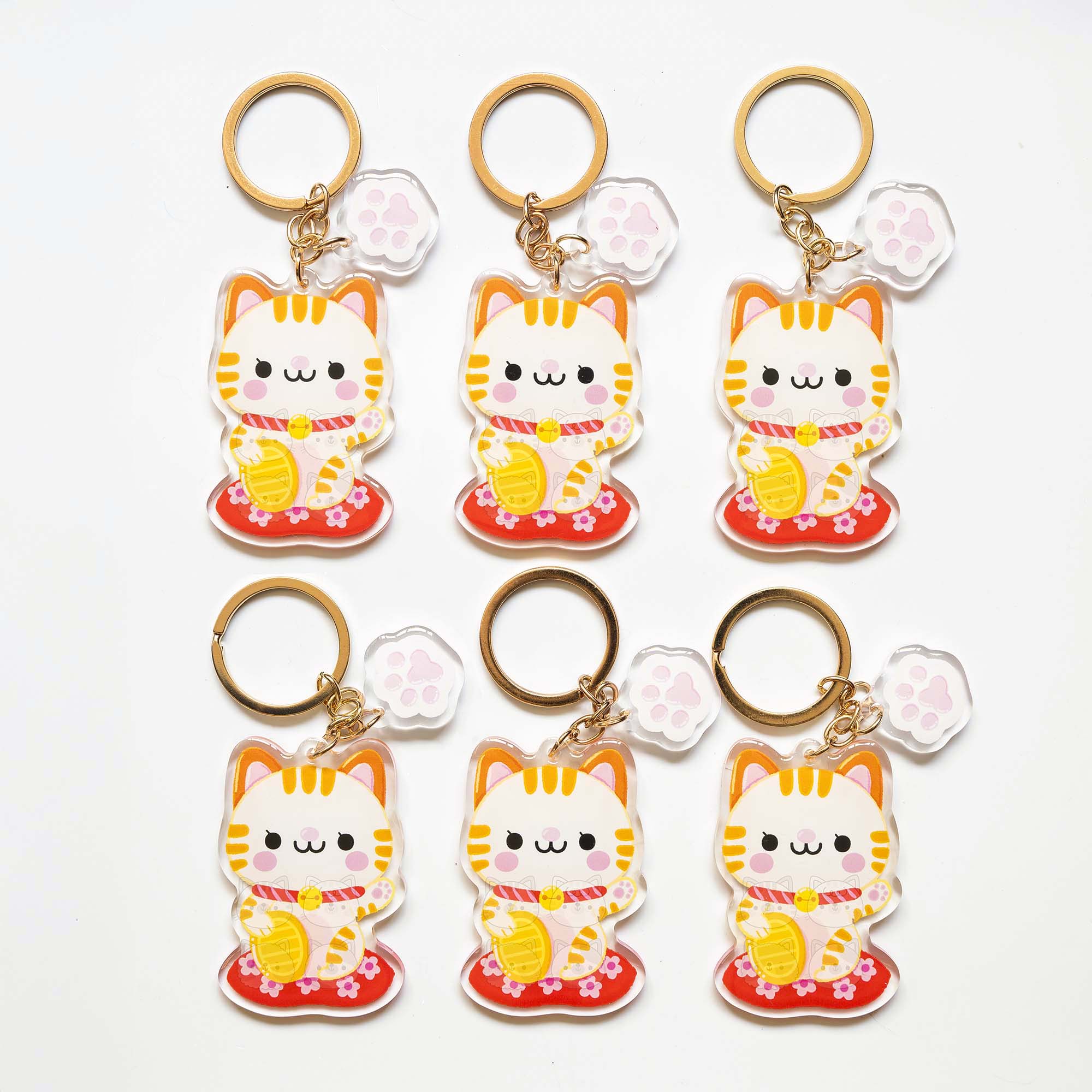 This Money Cat Keychain is made from 100% recycled eco-friendly acrylic and measures 2.5 inches along its longest length. It comes supplied with a gold chain and an additional keychain charm attached.