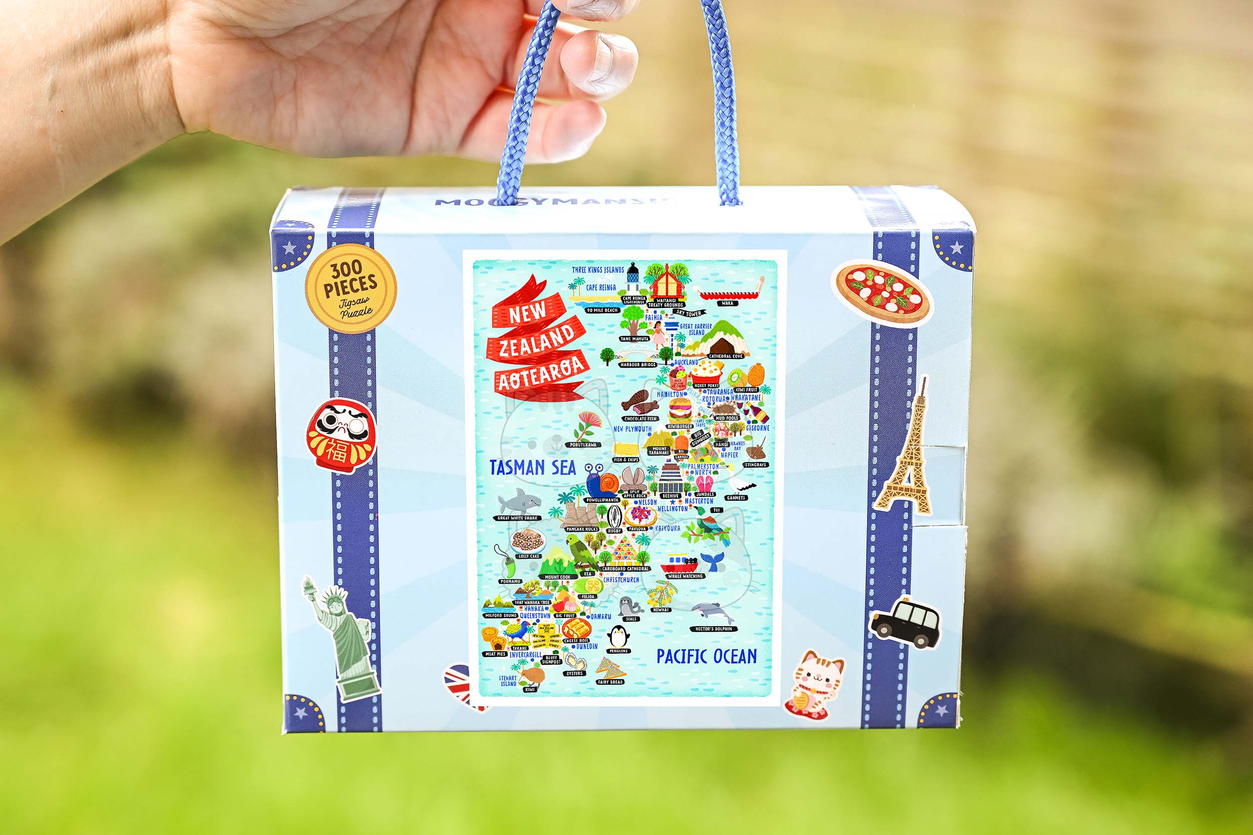 This New Zealand map puzzle comes supplied in a custom-made box that looks like a suitcase and shows our new branding. As of 2026 all of our products are moving over to our new website; https://moggymansions.com